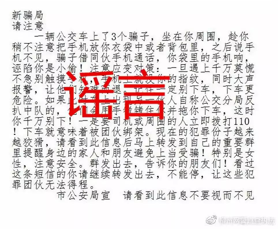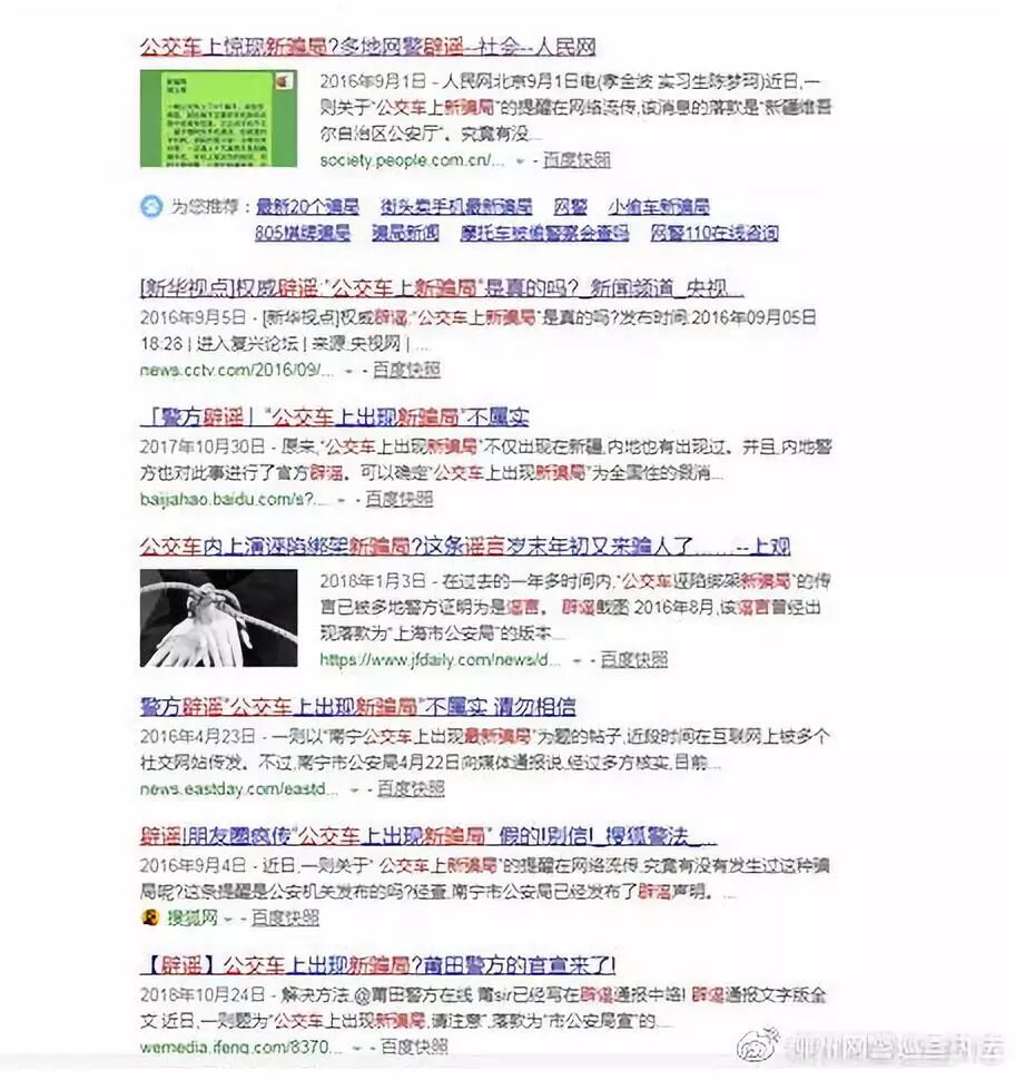 柳州网警立即对相关消息进行核实。经关联,发现以上信息早在2012年已在互联网上出现,自2016年以来,已在全国多个省市传播,目前新疆、福建、浙江、广西南宁等地警方均已进行辟谣。据此可以确定市公安局发布的“公交车上出现新骗局”提醒为全国性的假消息。