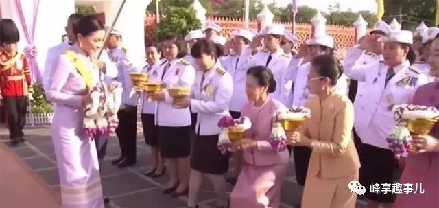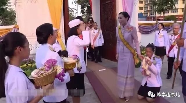 苏提达王后曾经是一名空姐,她面容较好、气质不凡,被玛哈国王一眼相中。随后又在国王护卫队锻炼了10年,对王室礼仪非常熟悉。今天,苏提达王后虽然没有国王老公的陪伴,但是对于寺庙的活动规则了如指掌。在泰国,紫色代表王后的颜色,一名侍卫撑起了一把紫色的御伞,为苏提达王后遮阳,现场军官纷纷向她赠送花环,这样的待遇与玛哈国王出行一模一样。这可是王后第1次单独出席寺庙活动,受到了如此隆重的待遇,难怪她笑得合不拢嘴。