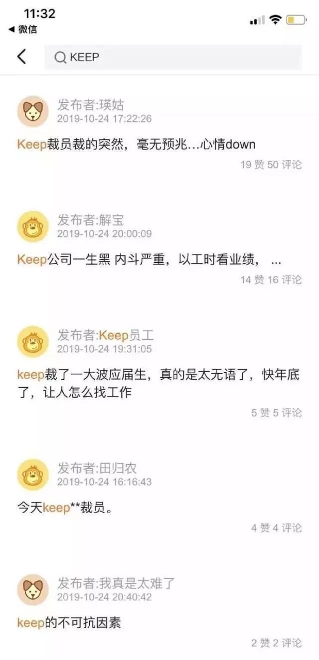 裁员大幕拉开后,被裁掉的keep前员工们很快组织起了一个微信群。此外,职场社交平台脉脉的keep职言区,也已经开始陆续有被裁员工的吐槽。