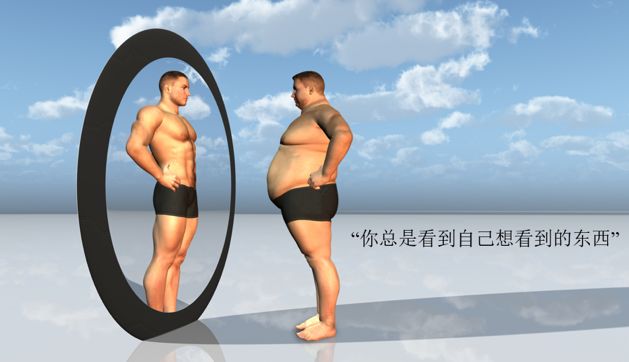 大家看下图的第一反应,“哇,一个大胖子!”可是这个人通过哈哈镜,看到的却是一个健硕、性感的自己。