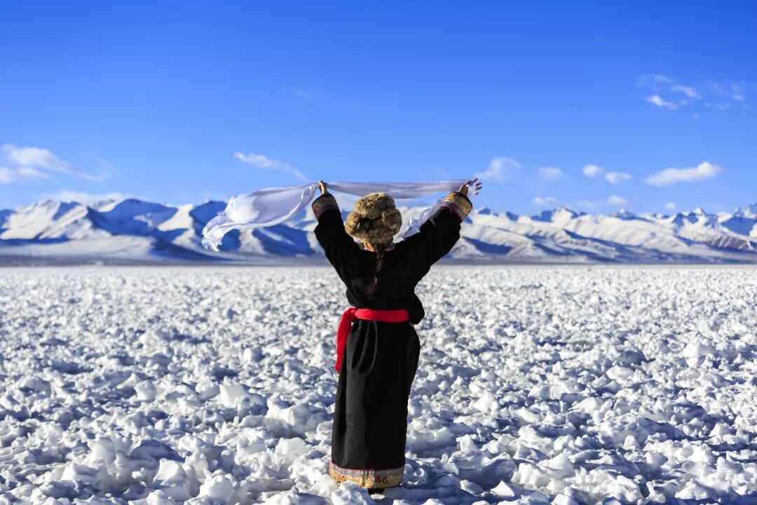 冻结成冰的高原湖泊就像一块耀眼却易碎的蓝宝石,靠近她的脚步也不自觉放轻;