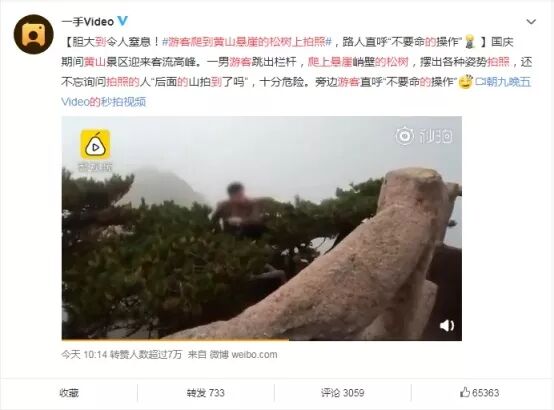 7天小长假中,黄山景区就出现了一名“不要命先生”,跳出栏杆,爬上悬崖峭壁的松树,让友人帮忙拍照,还不忘询问:后面的山拍到了吗?