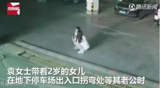国庆前夕,湖北应城某小区内,一对母女在停车场入口转弯处等待孩子的爸爸,并且原地蹲下。