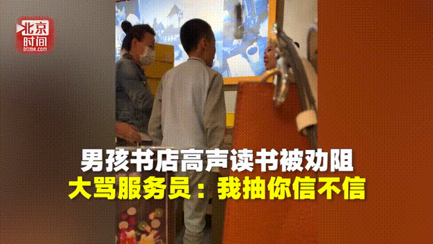 一个男孩在书店中大声读英语,完全不顾及其他人的感受。书店店员上前小声提示,却被男孩指着鼻子辱骂:“信不信我抽你!”“我投诉你丫的!”