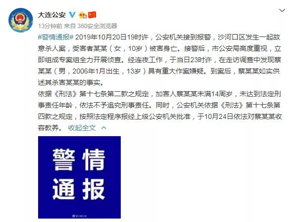 随后大连公安第一时间发布了消息称案情属实,已经对蔡某实施了收容教养。