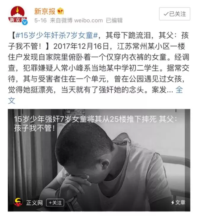 江苏常州15岁少年常小峰强奸了一名年仅7岁的女童后,还残忍的把她从25楼推下去,导致女孩的惨死。