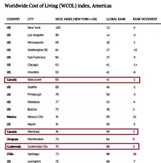 下图为北美各大城市的生活成本指数、全球排名和升降情况: