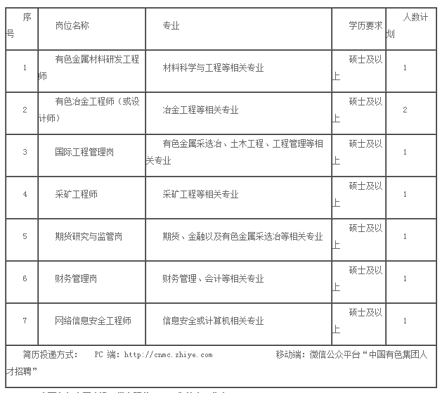 4、认可中国有色集团企业精神和价值观,愿意为国家的资源安全做出贡献。符合相关职位任职基本条件。