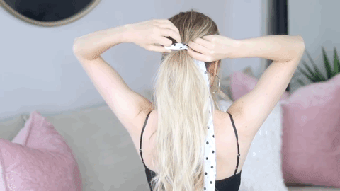 发带绑法最简单,扎个马尾,用方巾通过转圈——固定的方式“捆”起来即可。