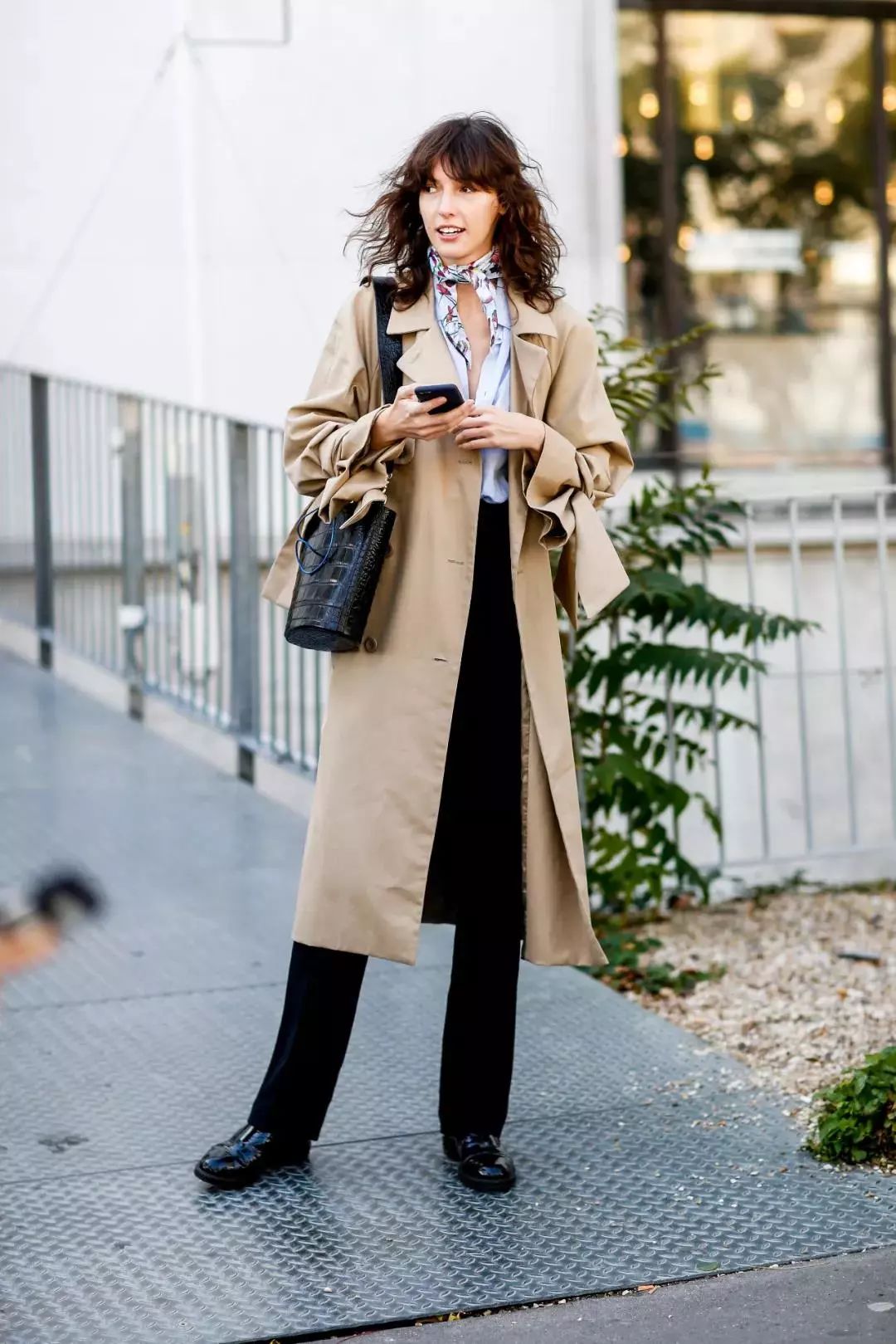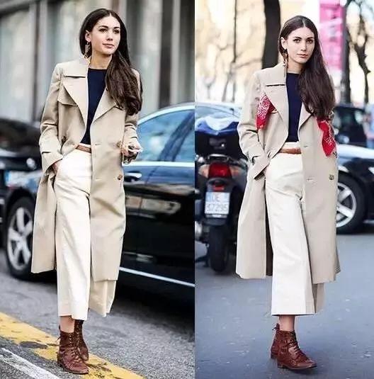 卡其色风衣一向是每年秋天必穿的经典单品,叠加一条和内搭色相呼应的小方巾,给人感觉独特、有风度。