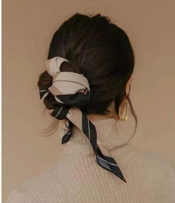 发带则是扎个松松的马尾,然后用方巾从下往上绑起来,把方巾的尾巴藏好,亲测不难。