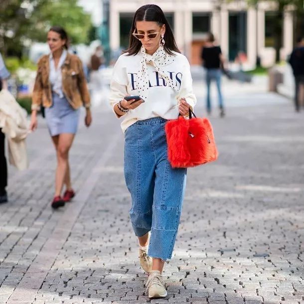 黑色字母的白色卫衣,搭配黑白波点款丝巾(或是其他黑白印花、拼色),整体色系不会乱,反而多了些时髦感~