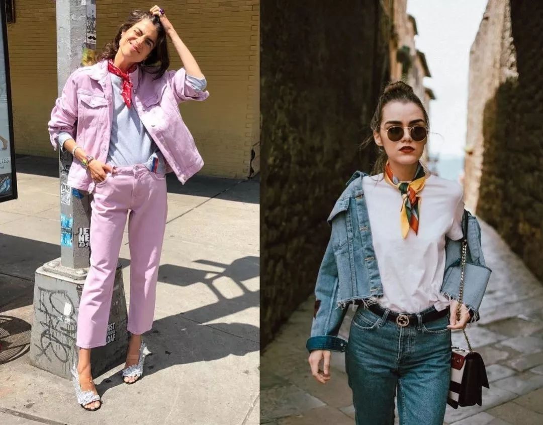 但如果要用丝巾搭配印花、字母等上衣,千层酥建议用同色系搭配的法则,让丝巾和上衣做呼应——