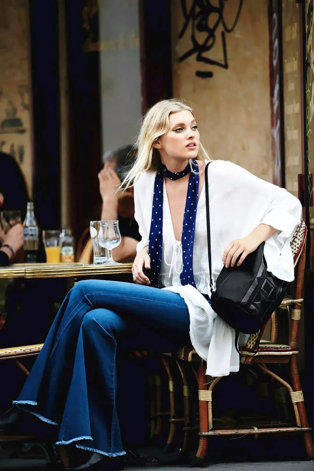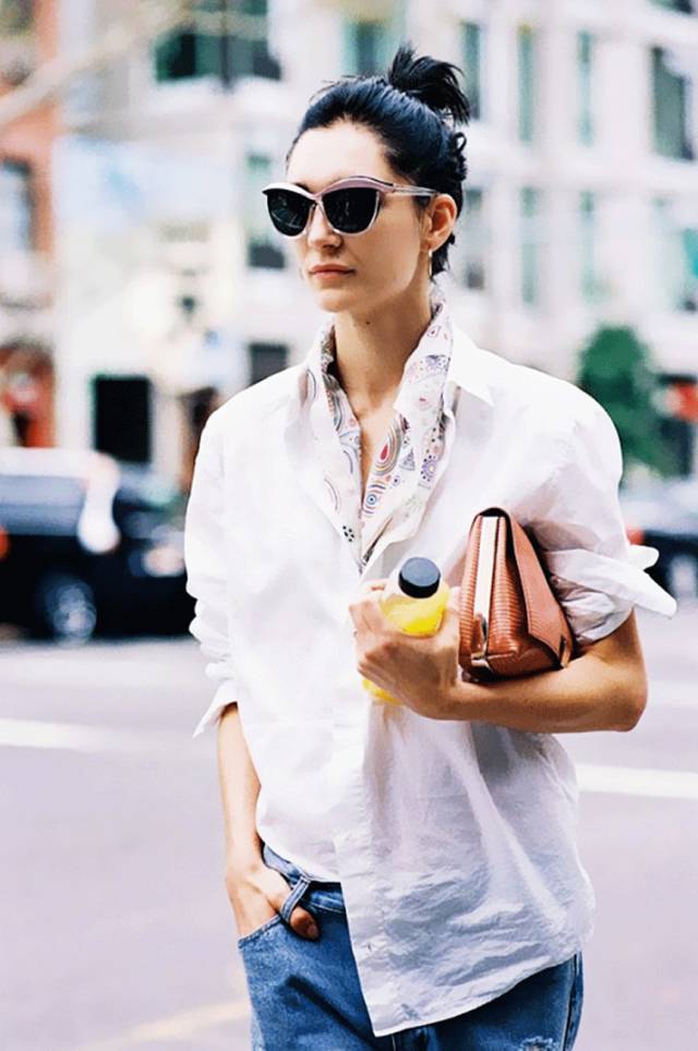如果是相对立挺的款式,可以将丝巾塞进衬衫里面,即便多解两颗扣子也不会走光,给人感觉帅气随性。