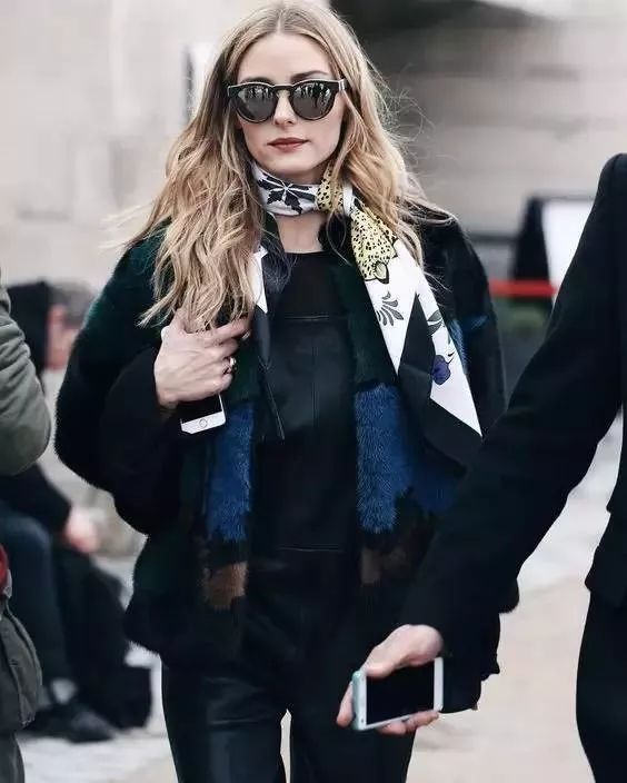“Always be a cool girl”,沉闷的黑色更需要用印花丝巾打破无聊感。