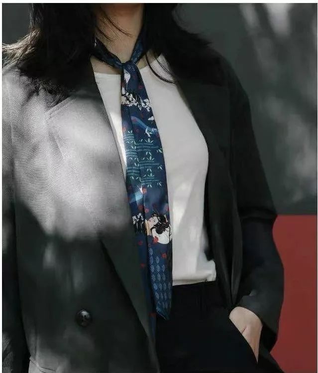 挂一条饱和度类似的纯色细丝巾,铁锈红、墨绿、藏蓝、焦糖色等都很合适。职业感瞬间减弱,还多了几分飘逸和干练。