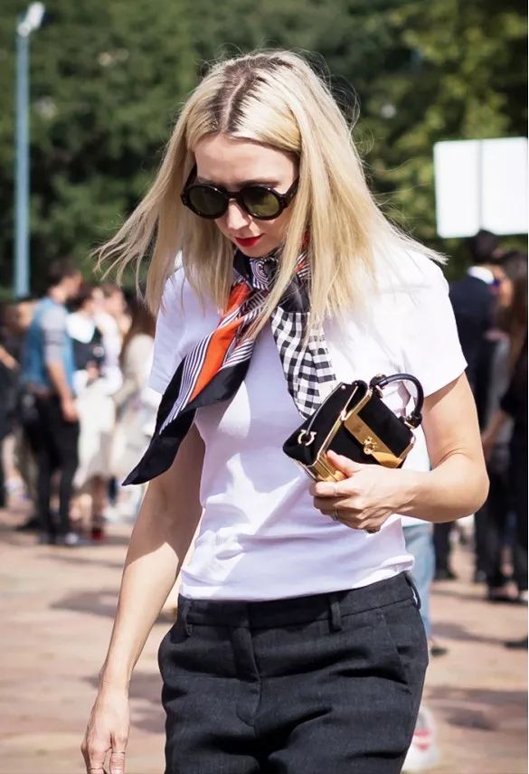 丝巾的款式本身就很多样,纯色、印花、纹路、甚至是几种图案相拼接;搭配白色上衣,就像有了个“衬托板”,姐妹们可以大胆选择自己想尝试的丝巾款式,完全不易出错。