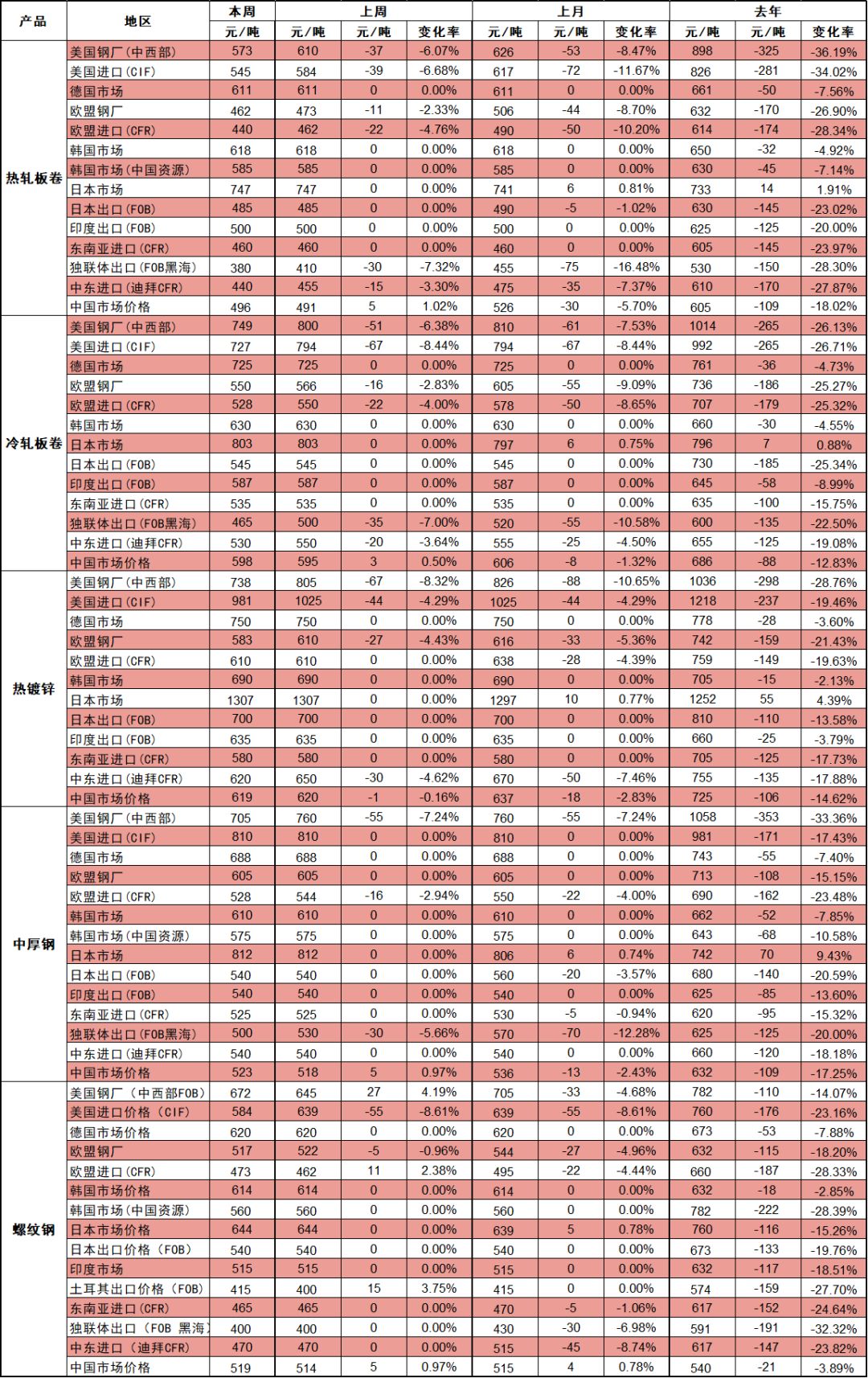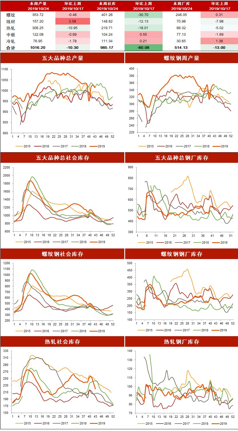 国际钢价:本周国际钢价下跌。美国地区板材价格下滑而长材价格上涨,截止10月19日止当周,美国国内粗钢产量184.1万吨,产能利用率79.6%,在钢价表现弱势的情况下,一方面产量小幅下降,9月美国粗钢产量同比降2.5%,另一方进口减少,1-9月美国成品钢材进口同比降16.1%,后期钢价有望企稳;欧洲市场钢价继续下滑,欧盟1-9月粗钢产量1.225亿吨,同比降2.8%,产量降低并不能解决需求低迷和出口压力,钢价或中长期均维持弱势;
