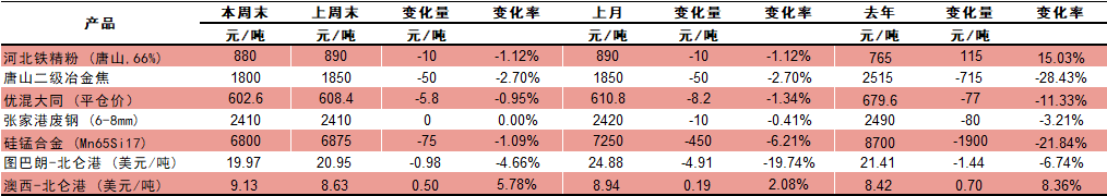 原材料:本周矿价涨跌互现。河北地区66%铁精粉现货价格880元/吨,周环比下跌10元/吨。日照港63.5%品位印度铁矿石价格641元/吨,较上周上涨16元/吨。普氏指数(62%)87.65美元/吨,环比上周上涨1.95美元/吨。本周全国高炉开工率持平,产能利用率周环比增0.28个百分点至74.55%,铁矿石需求保持平稳。受前期矿山铁路与港口检修影响,上周到港量继续下降,且四大矿山发货量周环比均下滑,短期供给回落或对矿价形成一定支撑;