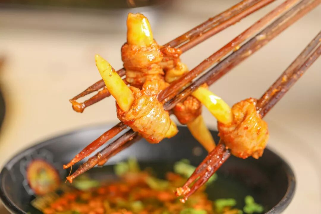作为肉食爱好者,小编对牛肉的抵抗力为0。一块块被腌制过的麻辣牛肉被串上串,饱满鲜嫩,看着就吞口水!