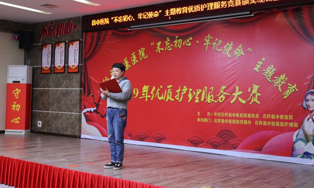 10月25日晚,石阡县中医院举办“不忘初心、牢记使命”主题教育优质护理服务竞赛颁奖晚会暨汇报演出,出席晚会的有县委主题教育第四巡回指导组组长邓绍梅一行,县委组织部相关负责人,县卫健局副局长冯茂昌,苏州市相城区中医院院长时菊明,苏州市相城区第二人民医院副院长傅海清,省中医药大学第一附属医院、省骨科医院驻中医院医疗专家邵章萍、张承馨,罗洪,苏州市相城区驻石阡中医院医疗专家林俊珍、周广海、李磊,院党政班子何强清、雷德强、杨锋、王忠强、彭强、戴江华,中医院干部职工参加。