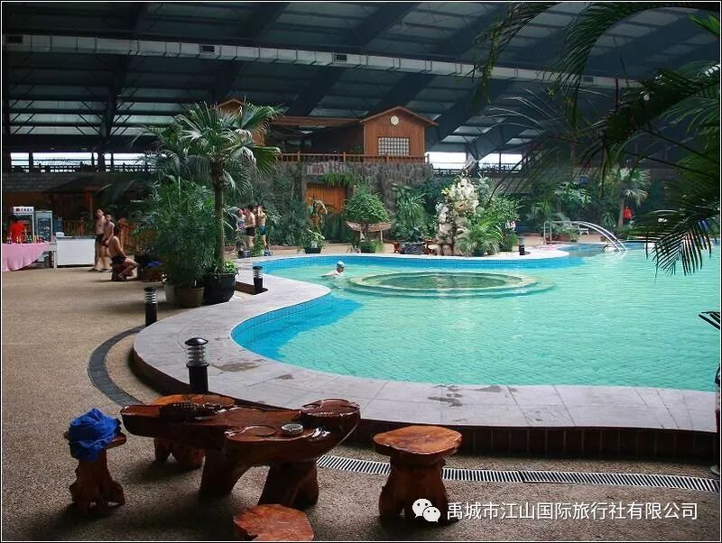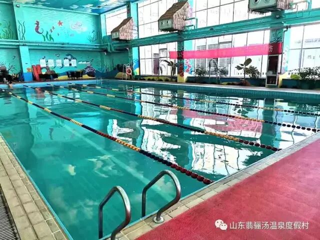小型国标游泳池:面积约320m?,深度约1.3m--1.6m,分为5个赛道,水质采用温泉水,水温为28-32℃。