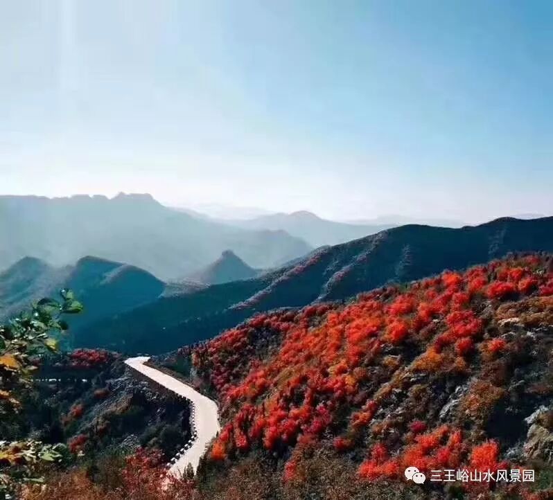 走到高处山峰,俯瞰三王峪的秋色,满眼的红彤彤色彩蔓延至天际,给瑟瑟秋季融进一股暖流,山道与红枫相映、霜叶与秋絮翻飞,沧桑中透着浪漫…