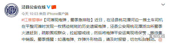 近日,在泾县桃花潭河边一推土车司机在平整河滩时发现一枚锈迹斑斑的历史遗留炮弹,泾县公安局桃花潭派出所蜀黍火速赶到,疏散围观群众,拉起警戒线,然后将炮弹平安运离现场保管,等待集中销毁。