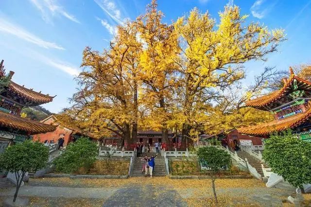 这些千年银杏树高大挺拔,蔚然成林,形成了一树树灿若黄金的奇特景观。风一吹,村在林中,林在村中,衬着夕阳的余晖,整个村子像一座金色城堡,地面是银杏叶铺就的黄色地毯。