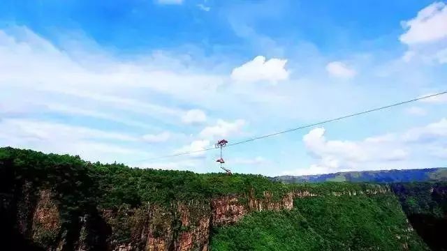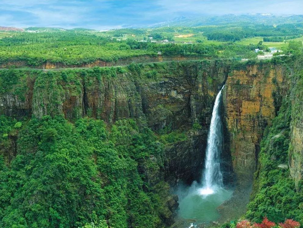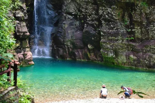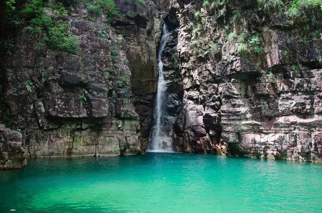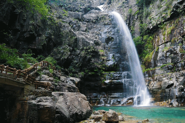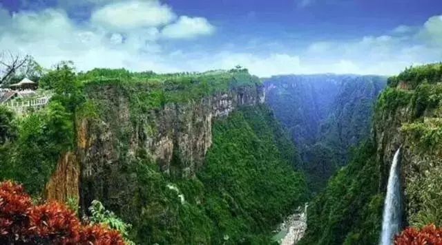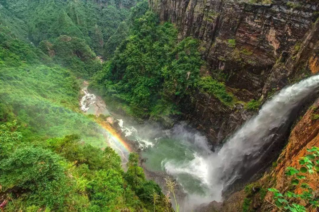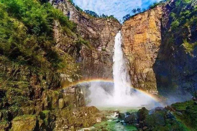 “两岸绝壁一线天,瀑布彩虹舞山涧”