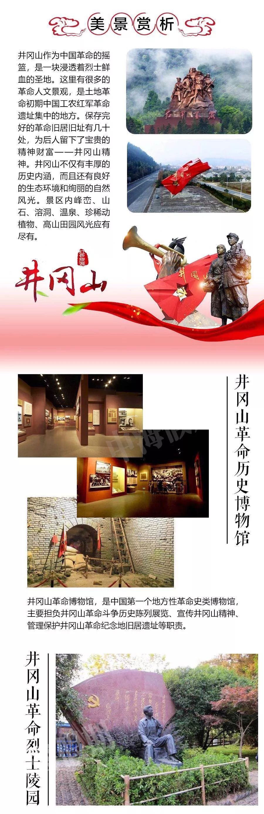 1D1 温馨的家—井冈山 早05:30涵江兴涵门、06:00莆田凤凰山、06:50仙游宾馆等指定地点出发(具体时间以导游通知为准),一路欢歌笑语前往革命圣地【井冈山】,一路欢声笑语车乘旅游大巴车赴中国革命摇篮江西井冈山(约600公里,约8小时左右),沿途观赏红土地的自然风光。井冈山位于湘赣边界、罗霄山脉中段,山势高大,地形复杂。抵达后参观井冈山标志---红旗雕塑广场,一面红旗迎接上井冈山的朋友。游览井冈山标志性建筑【红旗雕塑】(拍照时间为40分钟)为纪念井冈山革命根据地的创建,井冈山在泰井高速公路井冈山入口处,树立了一块巨型“井冈红旗”雕塑。它高19.27米,跨度27米,寓意井冈山革命根 据地创建于1927年。材质为内钢骨架,外喷氟碳漆。高高飘扬的红旗中间镶嵌五角星、镰刀斧头和“井冈山”三字,熠熠生辉,光彩夺目。雄伟壮美的“井冈红旗”大型雕塑有三层寓意。一是它像一块屹立不倒的巨石,象征中华人民共和国在井冈山奠基;二是它像一团熊熊燃烧的火焰,寓意中国革命的星星之火从井冈山燎原;三是它像一面高高飘扬的旗帜,矗立在四面环山的平畴之上,刺向苍穹,昭示中国革命从井冈山走向胜利。游览井冈山茨坪高山平湖—【挹翠湖】(游览约1小时)挹翠湖之美是一种令人沉醉的美。沿湖边林荫小路慢慢行走,但见湖四周的树倒映水中,将湖水“染”成满眼的翠绿色,间或有游人脚踏小船从湖中穿过,搅动一池碧水,如同要溢出一般。环湖四周处处景观也彰显了老一辈革命家浴血奋战遗留下革命精神印记。后入住酒店。