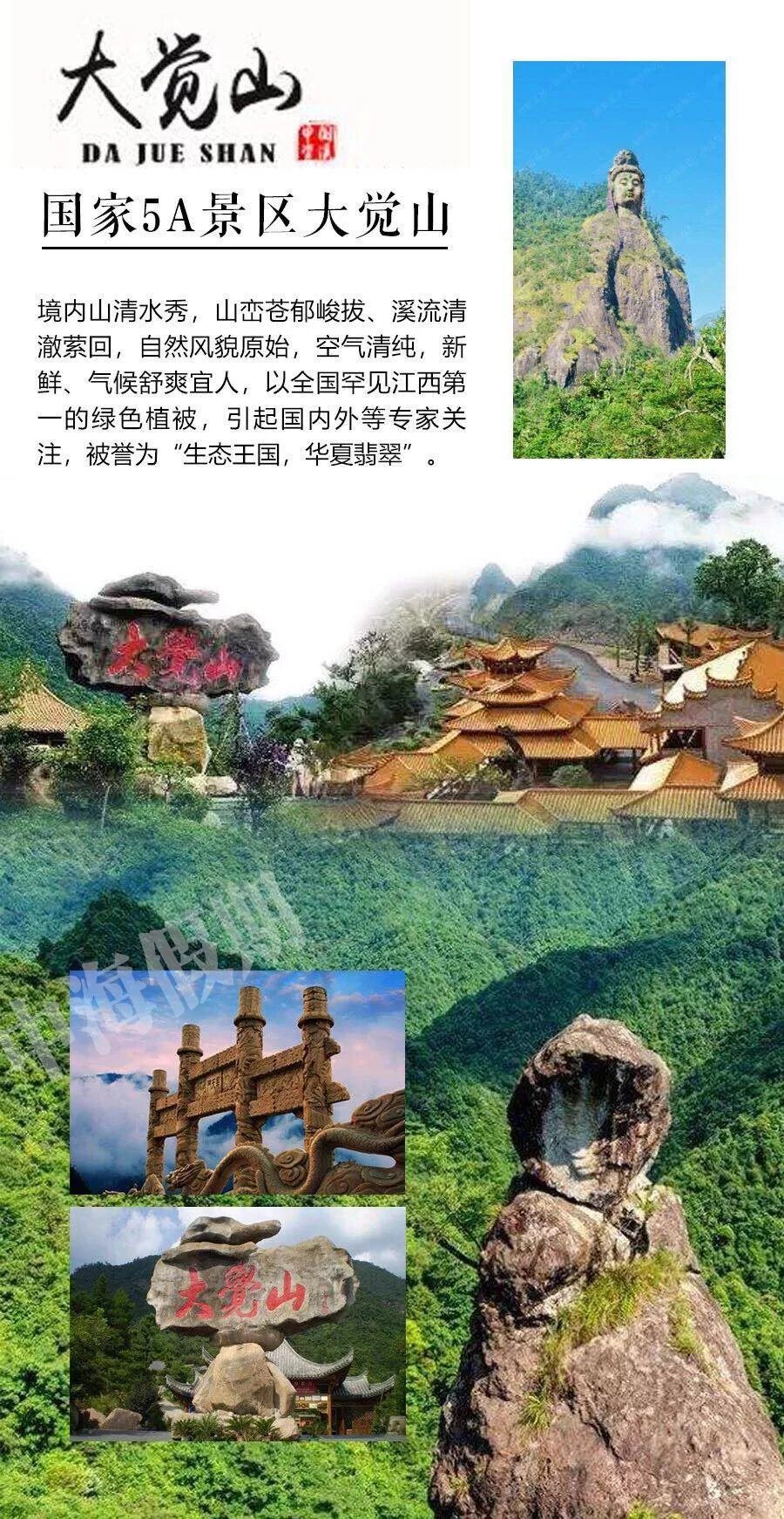 4D4 抚州-温馨的家 早餐后赴资溪,游览国家5A景区【大觉山】(观光车+往返缆车自理)乘坐观光车前往【大觉山古镇】,该景为《天仙配》、微电影等拍摄影视基地。游览结束乘坐观光车前往【大觉山】(门票赠送)乘坐索道进入登山区,大觉山客运索道全场1678米,水平距离1380米,高空280米,最大倾斜角度为32度。高空俯瞰原始森林风光、高山湖泊、森林云海及古朴典雅的小桥流水和轻纱千丈的云海、飞流直泻的银河瀑布,一览山中奇石嶙峋、云雾缭绕、林密幽绝、泉声潺潺。在索道终点站与大觉寺主峰接连悬崖绝壁处,挑战悬挂于山崖峭壁间的中国首条高空玻璃桥也被称为“太空步廊”,置身于太空云之海之中,体验人生百味,感悟自然神圣。继续前往中国佛教圣地【大觉岩寺】焚香祈福。佛光灵验、香火旺盛的大觉岩寺庙距今已有1600多年的历史,步入天仙配中的【南天门】来一次与天庭的对话。赴乌石真相风光带【草坪公社知青礼堂】(游览30分钟)感知岁月,体验文化;来一场知青文化之旅,重温激情燃烧的岁月,既是对历史的回味,又是对现实的品尝;既是寻找昔日青春记忆的线索,又是寄托当今情感的纽带。游览结束,乘坐大巴返回温馨的家。 含早餐