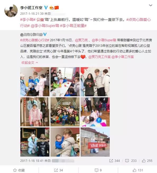李小璐工作室曾多次晒出过她参加公益活动时的照片,大部分是同孩子们的合照。李小璐与贾乃亮共同创办过一个名为“点亮心路”的公益组织,二人也多次一同现身公益活动。