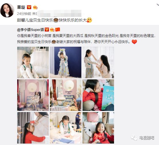10月23日是贾乃亮与李小璐女儿甜馨的7岁生日,24日早,董璇转发了李小璐为甜馨庆生的博,并表示“甜馨儿宝贝生日快乐,快快乐乐的长大”为甜馨送上生日祝福,粉丝们纷纷评论道:“甜馨生日快乐啊”“宝贝是天使,一定要快乐长大”“祝福亲爱的小甜馨,生日快乐”