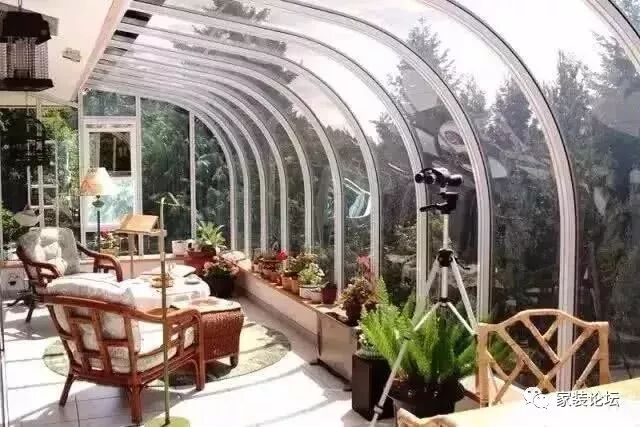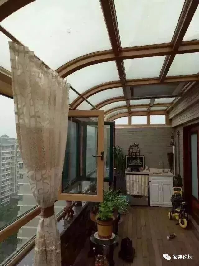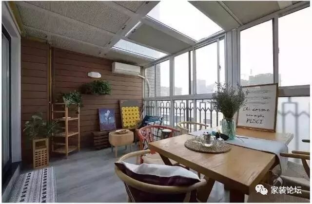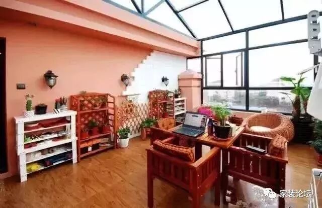 4、露台功能房:自家露台也可以装成封闭式的,这种便于更好的利用,用来当茶室、储物间、洗衣房、会客室都行,让室内多出一可用空间,任由支配,这样室内的空间就变得更大了,需要注意的是要做好隔热措施,比如安装隔热帘、贴上玻璃隔热膜、空调、以及别的降温系统等,这样能够大大降低温度。