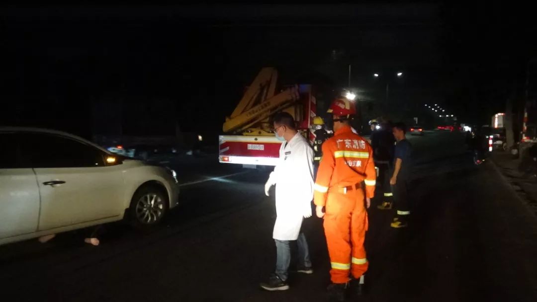 当晚19时20分左右,东凤镇专职消防中队接到报警赶到事故现场,只见一辆白色小车开着双闪停在中间一条车道上,还有一辆摩托车倒在路边不远处。