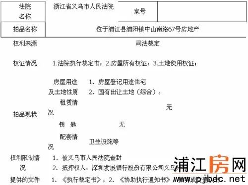 拍卖对象:位于浦江县浦阳镇中山南路67号,房屋共7层,所在层数1-7层,建筑面积693.92平方米,另建有无证建筑约87.6平方米,混合结构,主体东西朝向,垂直房,已装修,土地使用权面积140.88平方米,使用权类型为出让,登记用途为综合用地,终止日期2065年9月9日。房屋登记时间2000年11月22日。