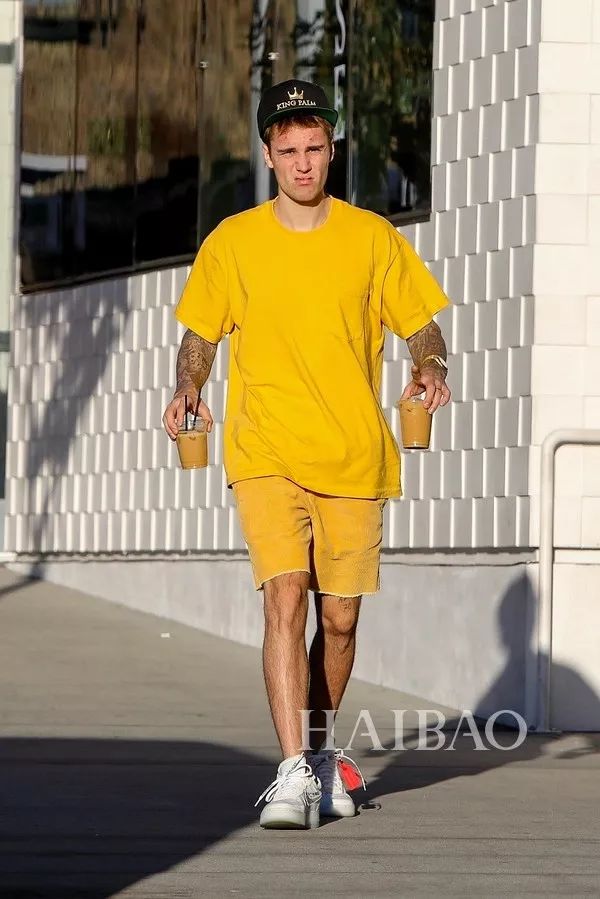 比伯这次的裤子提好了,但是整体的色彩更有冲击力了。大面积的亮黄色在阳光下晃得人睁不开眼,自带光晕效果,不知道比伯是不是也被自己给晃到了呢?
