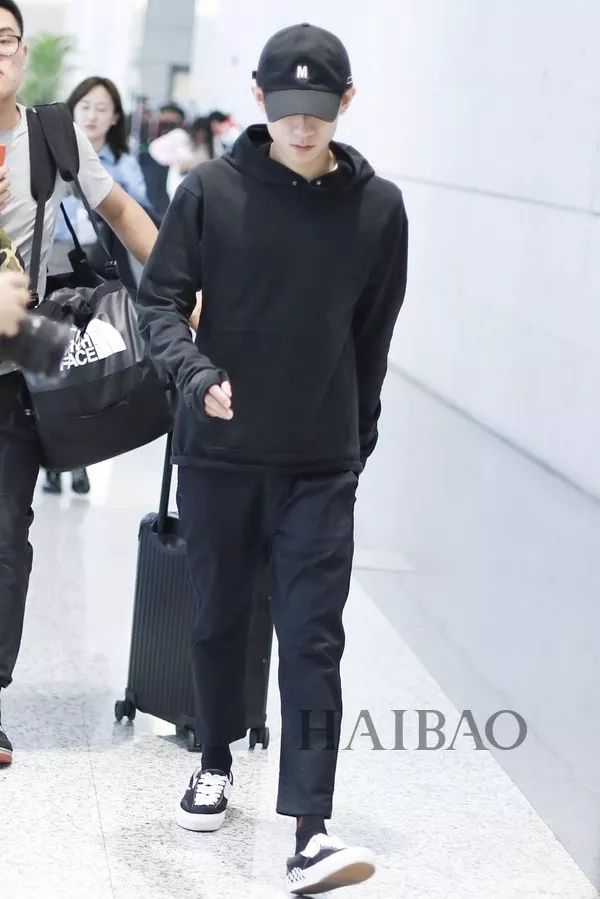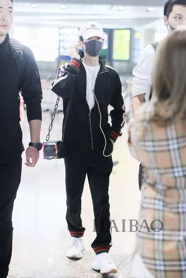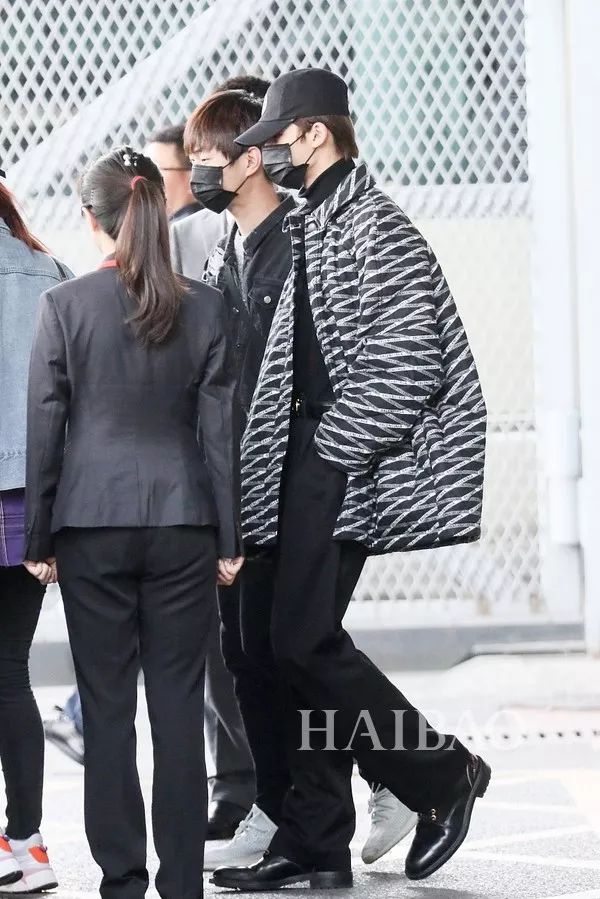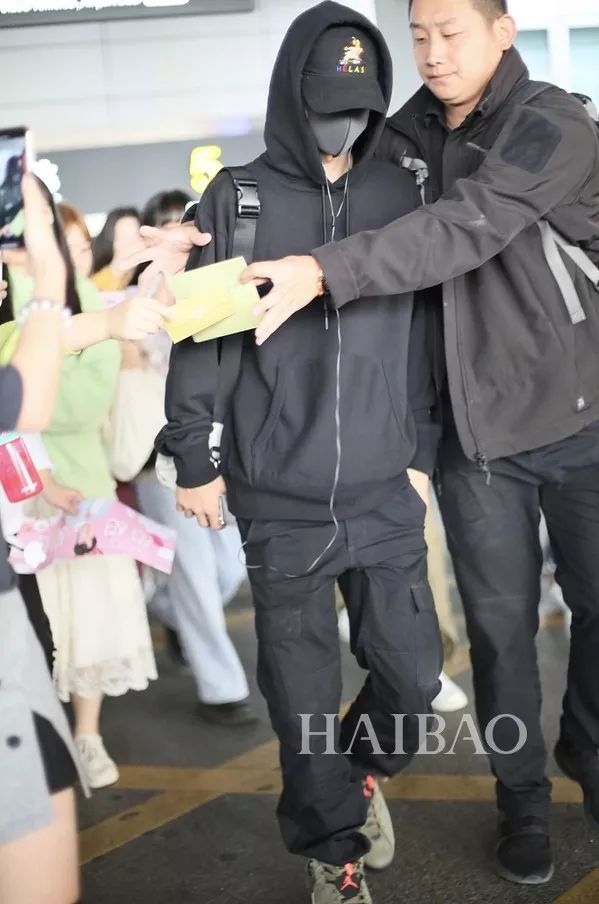 我们的酷盖耶啵依旧一身黑色Look亮相!棒球帽工装裤,帅气元素一样不落!在高大的保镖大哥全方位保护的怀抱中,耶啵显得有些小娇小呢~
