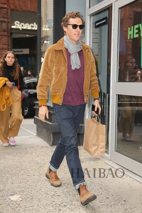 和本尼的发际线一样高的是他的穿衣品味,标准的英伦绅士风格。灯芯绒外套,卡其色踝靴,尽显低调内敛英伦风。