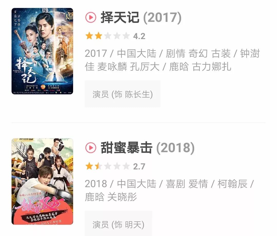 就像曾经的顶级流量鹿晗,如果好好做个综艺咖、跳跳舞唱唱歌也不错,结果一进军影视圈真是烂剧一部接一部,《择天记》、《甜蜜暴击》豆瓣评分4分以下,还有前段时间彻底扑街的《上海堡垒》。