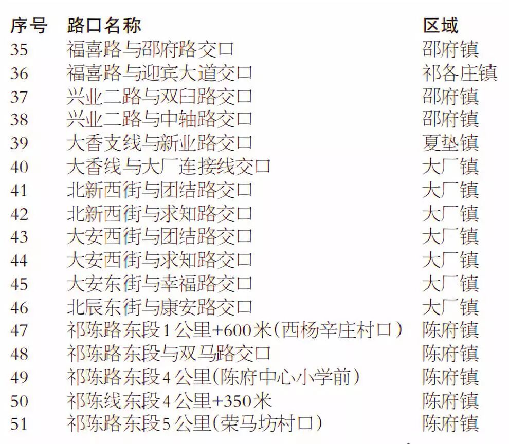 根据《中华人民共和国道路交通安全法》及公安部《道路交通安全违法行为处理程序规定》(第105号令)第十六条第二款规定,现将大厂县新增的固定式交通技术监控设备设置地点予以公布。