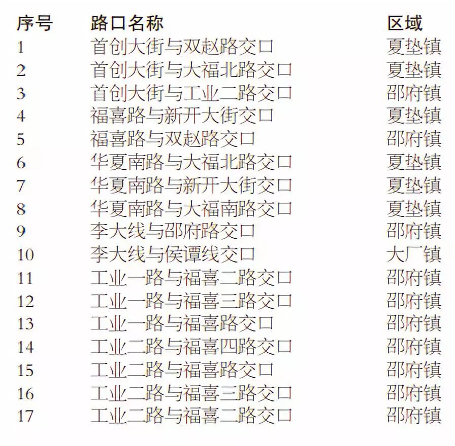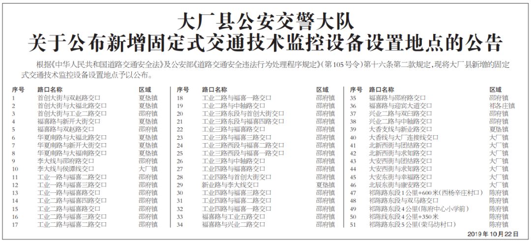 大厂县公安交警大队关于公布新增固定式交通技术监控设备设置地点的公告