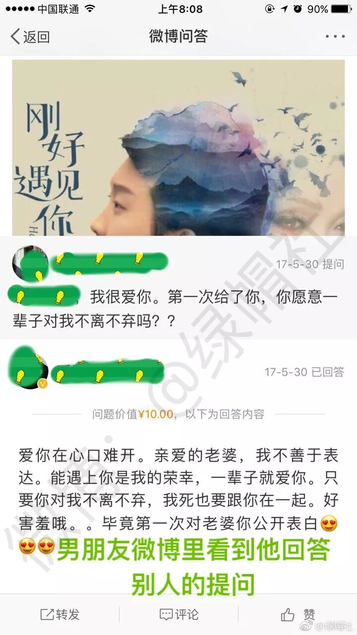 我平时都是用男朋友的微博,结果无意间看到他微博问答中回答别人的问题,才知道自己被“小三”.
