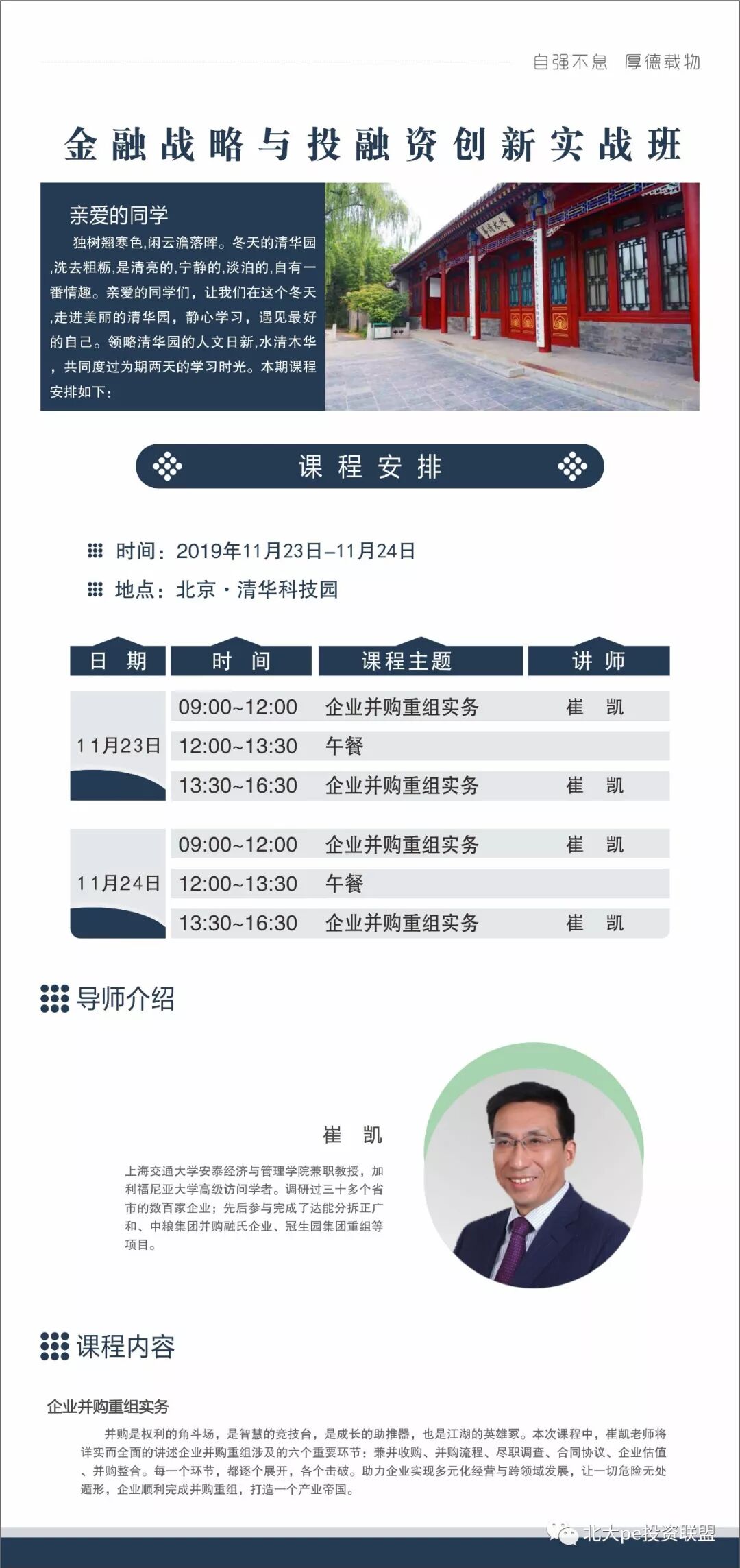 项目背景:现今中国进入了多样化的市场资源配置和融资时代,中国企业家不仅仅面临企业产业升级的挑战,而且面临着如何更好的让金融资本与产业相结合,拥有“资本战略”思维模式的企业家才能在转型中紧抓机遇,立于不败地位。新环境下企业如何选择自己的方向,定位战略目标?如何利用资本市场实现公司的持续发展和快速增值?金融战略与融资创新实战班”课程立足于帮助学员了解资本市场大环境,明确自身企业的资本战略,掌握与资本市场对接的操作流程,并清晰把握资本运作过程中的财务和法律风险,储备资本运营知识,以帮助企业通过资本市场实现快速増值。