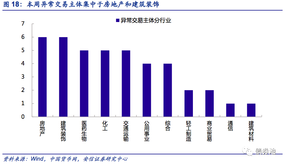 本周信用债异常交易[3]回落,共84笔,环增9%;涉及48个主体,环增55%。从行业看,异常交易主体主要分布在房地产和建筑装饰,各占6%。从企业性质看,异常交易主体中,国企、民企各占45%、55%;分是否城投债来看,异常交易主体集中非城投,占87%。