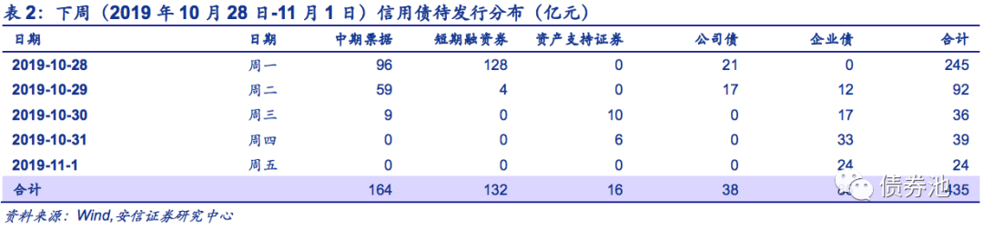 下周(10月28日-11月1日)待发行信用债共计435亿元。其中,中票和短融较多,分别为164亿、132亿。
