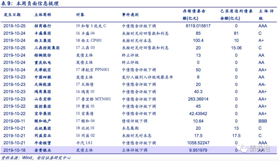 本周首次违约1家、主体评级下调1家、中债隐含评级下调8家。其中西王集团首次违约,未按时兑付本息。公司2019上半年盈利下滑,且近期多期债券面临到期兑付或回收,整体流动性较紧张,偿债压力较大。金贵银业主体评级由BB-下调至B-。公司控股股东曹永贵非经营性占用公司资金并未能及时归还所占用资金,对公司偿债产生不利影响;且累计被司法轮候冻结股数超过其实际持有上市公司股份数;公司流动性紧张,偿债能力弱。