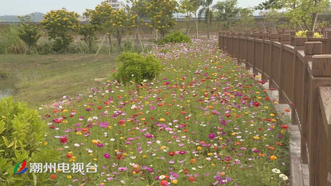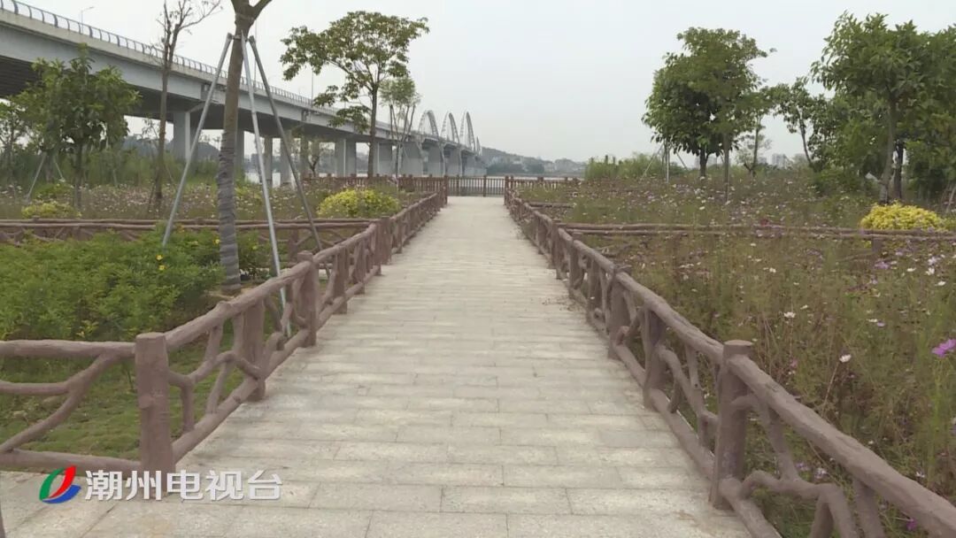 湿地公园内绿草茵茵、花团锦簇,栈道平整美观。据悉,目前金山大桥湿地公园已完成了五个观景台和两个观景亭的建设,公园开放后,市民游客可通过亭台眺望韩江美景。