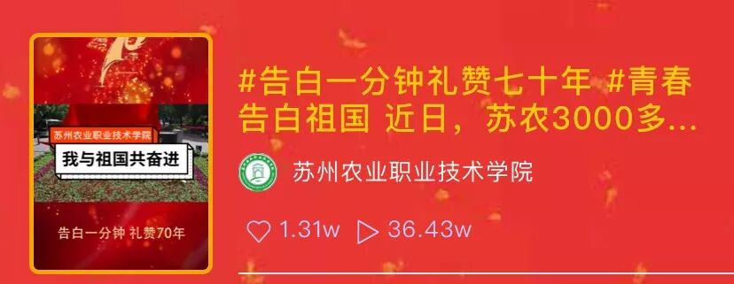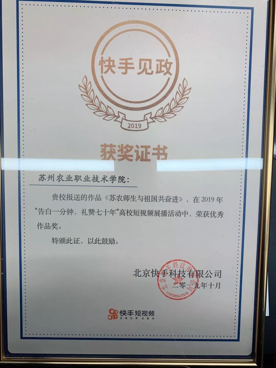 70年风雨兼程,70年砥砺奋进,在新中国成立70周年之际,教育部政务部新媒体联合快手发起了#告白一分钟 礼赞七十年#高校短视频展播活动。今年9月至8月#告白一分钟 礼赞70年#活动期间,来自全国70余所高校共提交了5634个作品,3.76亿人次参与,30个作品获奖。我院《苏农师生与祖国共奋进》脱颖而出,荣获“优秀作品奖”!
